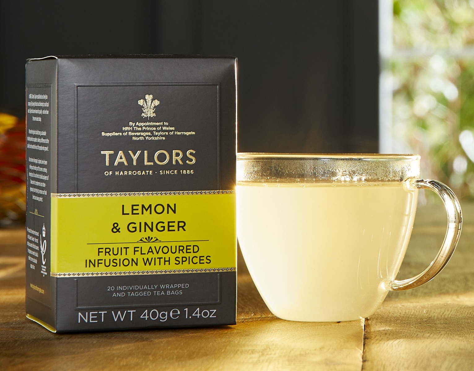 Taylors Lemon & Ginger Infusion tea 1 x20 individually enveloped, string and tagged tea bags.